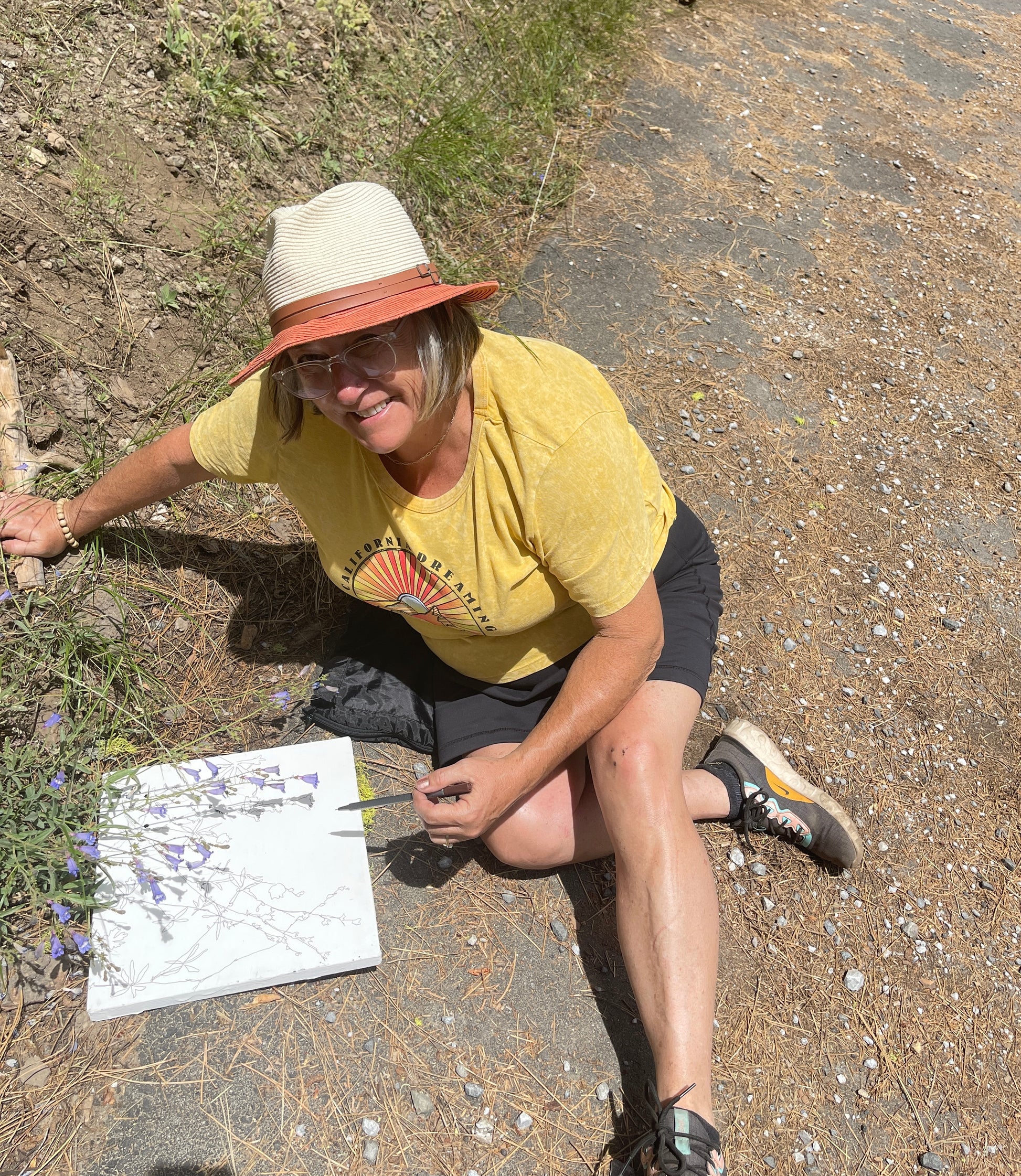 This 12" by 12" acrylic and felt tip pen on canvas painting features images of California wildflower shadows collected from Pinecrest Lake in Pinecrest, CA during August 2023. The specific wildflowers depicted are Aster occidentalis, Penstemon speciosus, and Sidalcea glaucescens. This bright and cheerful painting captures the essence of a sunny day.