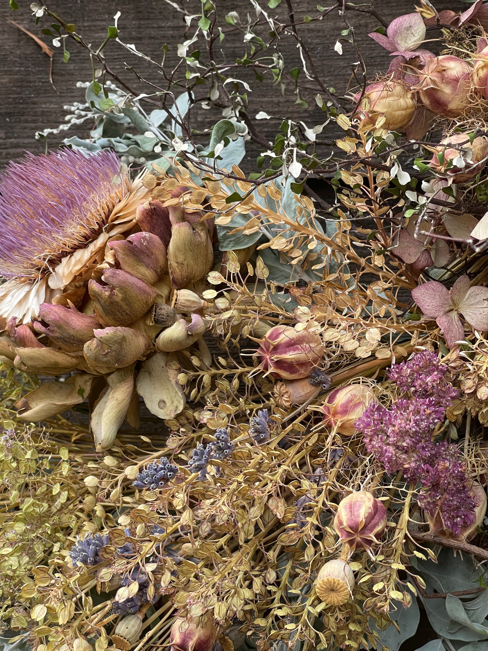 Crafted from a hand-picked assortment of cardoons (artichokes) and various plant materials, this wreath boasts a stunning purple hue. Perfect for those who appreciate the color purple, this wreath is a must-have.