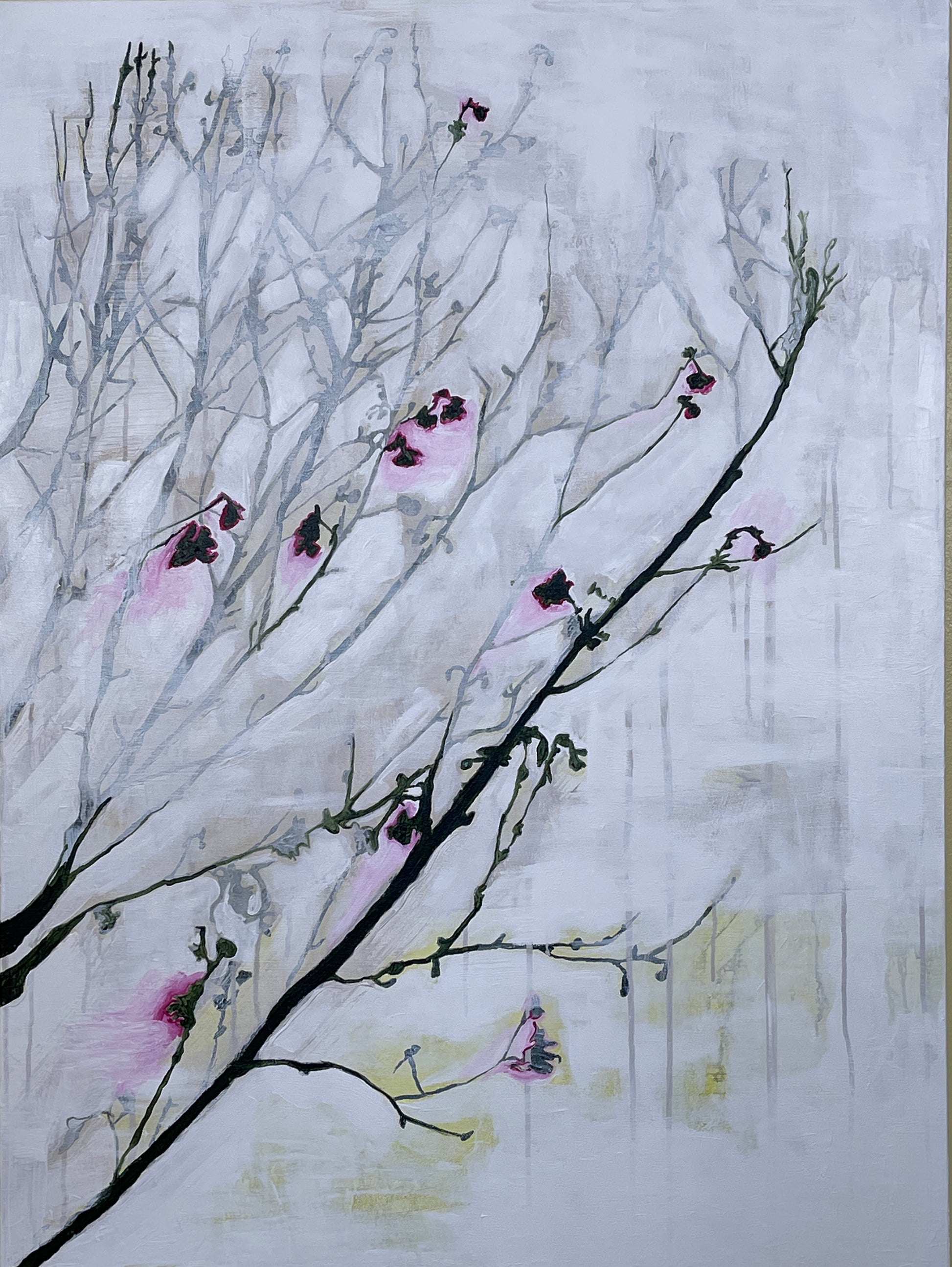 This painting, Ribes sanguineum is bush that lies dormant as a pile of sticks all winter, in the early spring it forms the tiniest magenta flowers that grow into a bloom that is reminiscent of a shrimp tail.