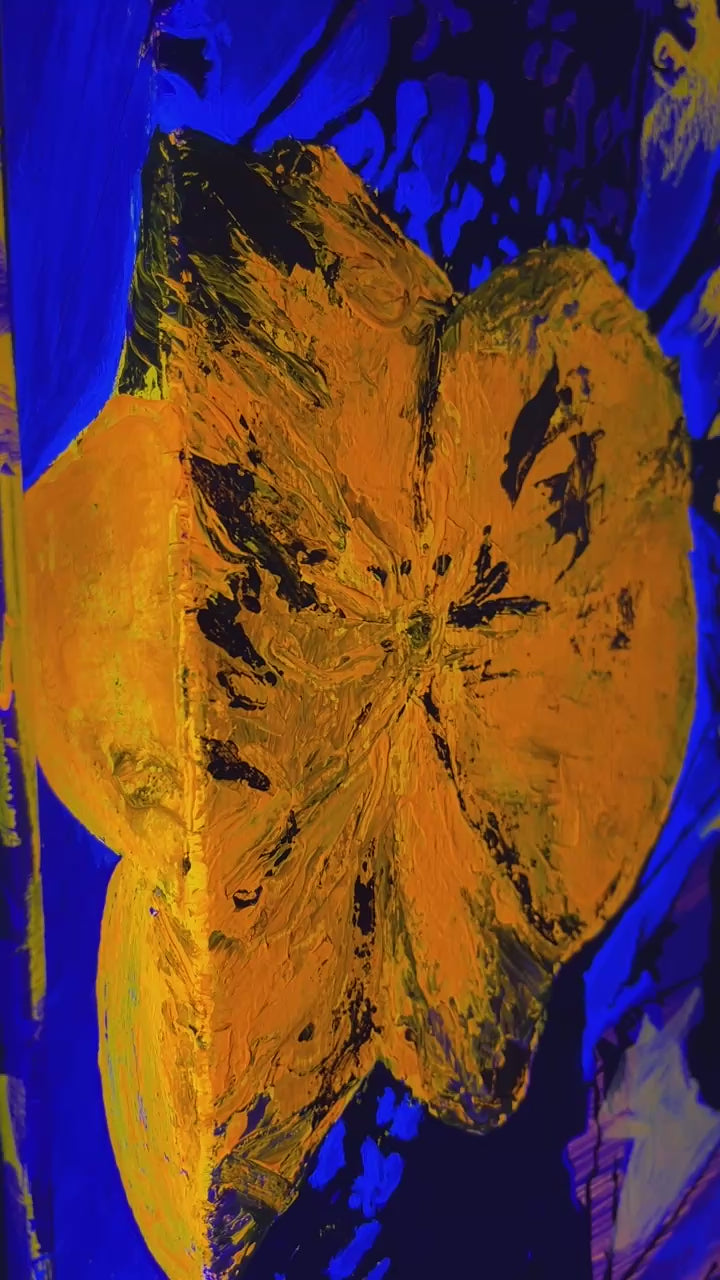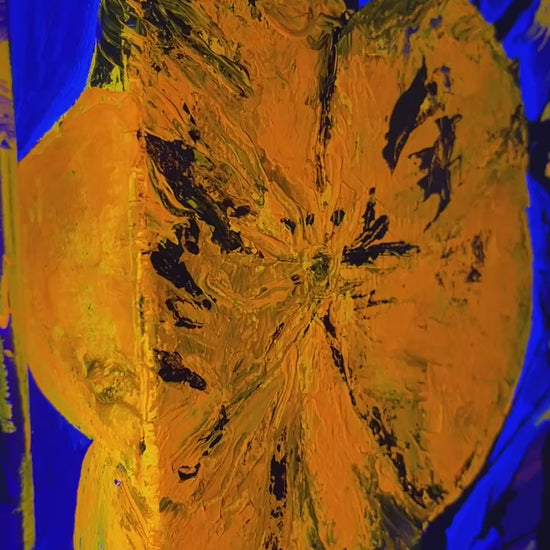 Sunset Poppies showcases an innovative approach to acrylic painting, employing fluorescent pigments to create a dual-experience artwork. The composition captures California poppies rendered as cast shadows in natural daylight, yet transforms dramatically under blacklight illumination, revealing vibrant luminescence that mirrors the intensity of midday sun. This technique effectively merges two distinct visual narratives within a single canvas, offering viewers a dynamic exploration of light, color, and perception.