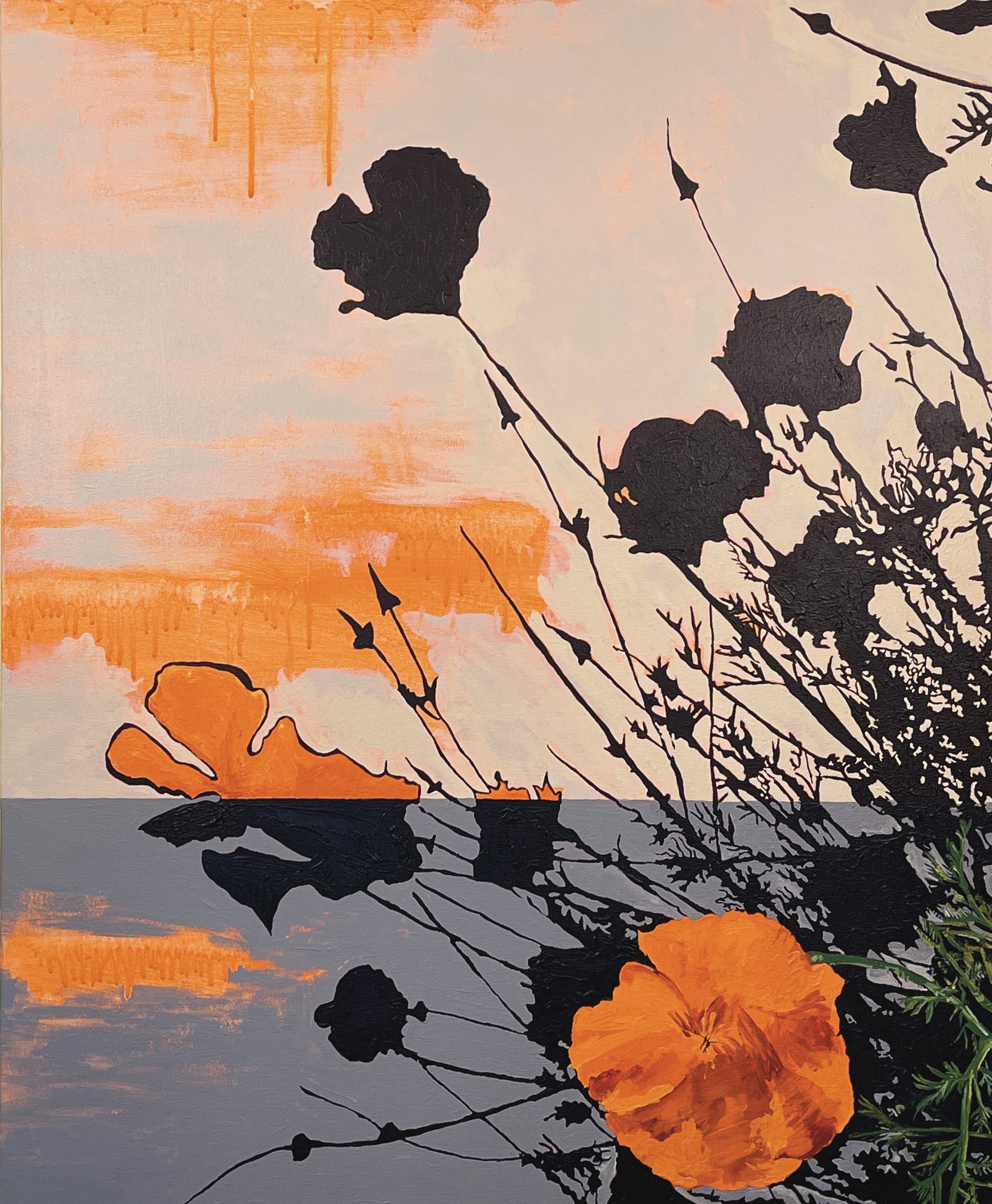 This 'Yale court poppies' acrylic painting is a study on color theory. It is an example on how mixing certain colors the artist can create different values of the color black. The top part of this painting is painted in a warm black tone and the bottom is painted in a cool black tone.